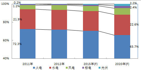 圖 1 2011-2020年中國電能消耗結(jié)構(gòu)及預測(按發(fā)電量統(tǒng)計)