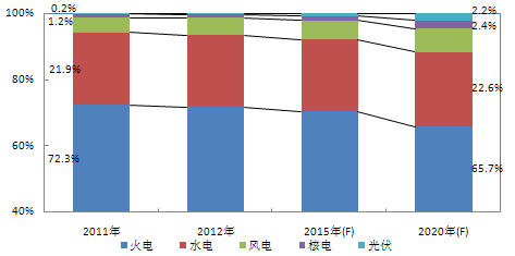 圖1 2011-2020年中國(guó)電能消耗結(jié)構(gòu)及預(yù)測(cè)(按發(fā)電量統(tǒng)計(jì))