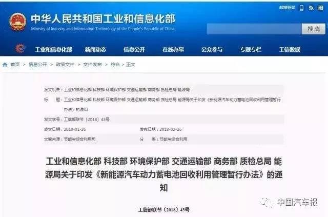 據(jù)悉,在新能源汽車動力蓄電池退役潮還沒來臨時(shí),國家及相關(guān)部門已經(jīng)從頂層開始了動力蓄電池的溯源體系建設(shè)。今年,《新能源汽車動力蓄電池回收利用管理暫行辦法》等與動力蓄電池相關(guān)的政策法規(guī)陸續(xù)推出,表明我國政府對動力蓄電池回收利用問題高度重視,并走出規(guī)范管理的第一步。