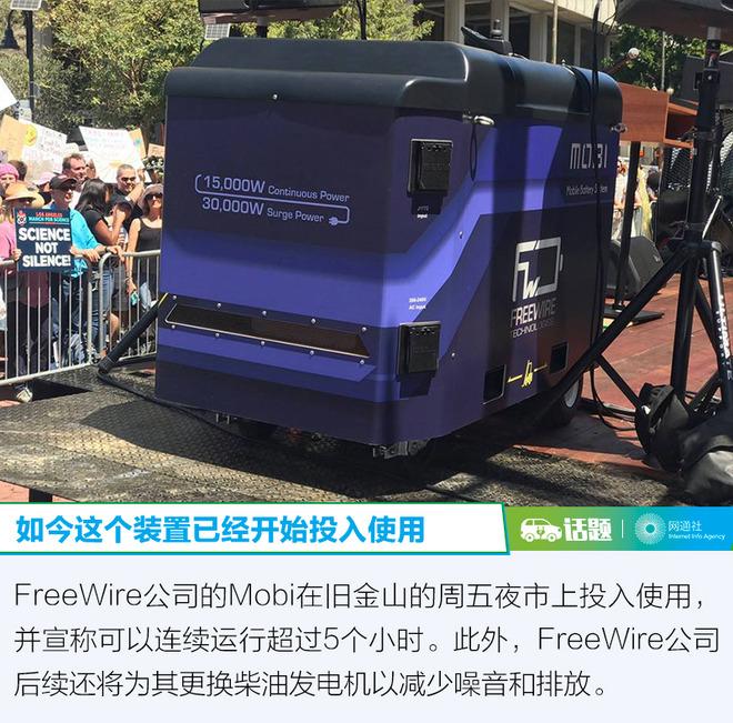 根據(jù)FreeWire公司的介紹,這個(gè)移動充電車已經(jīng)推出了“升級版”,儲能從最初的48千瓦時(shí)增加到80千瓦時(shí),可以連續(xù)運(yùn)行五個(gè)小時(shí)以上。今年4月20日,該移動充電站在舊金山地區(qū)的福特·梅森中心里進(jìn)行了實(shí)際應(yīng)用,當(dāng)天正好是夜市。該項(xiàng)目在FreeWire公司看來是給了那些舊電池第二次生命,車主在使用時(shí)也是非常方便,可以通過平板電腦或手機(jī)操作,充電車位被占用的問題也得到了解決。