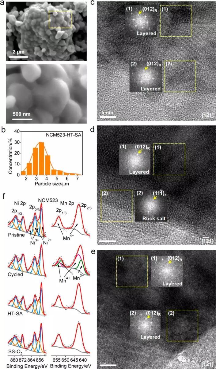 圖3. (a) 再生NCM523顆粒的SEM圖像,(b) 再生NCM523二次顆粒的尺寸分布,(c) 經(jīng)過(guò)水熱和燒結(jié)法再生的NCM523顆粒的HR-TEM圖像 (d) 經(jīng)過(guò)在空氣中直接燒結(jié)法再生的NCM523顆粒的HR-TEM圖像,(e) 經(jīng)過(guò)在氧氣中直接燒結(jié)法再生的NCM523顆粒的HR-TEM圖像,(f) 原始、循環(huán)后、再生后的NCM523的XPS譜圖。