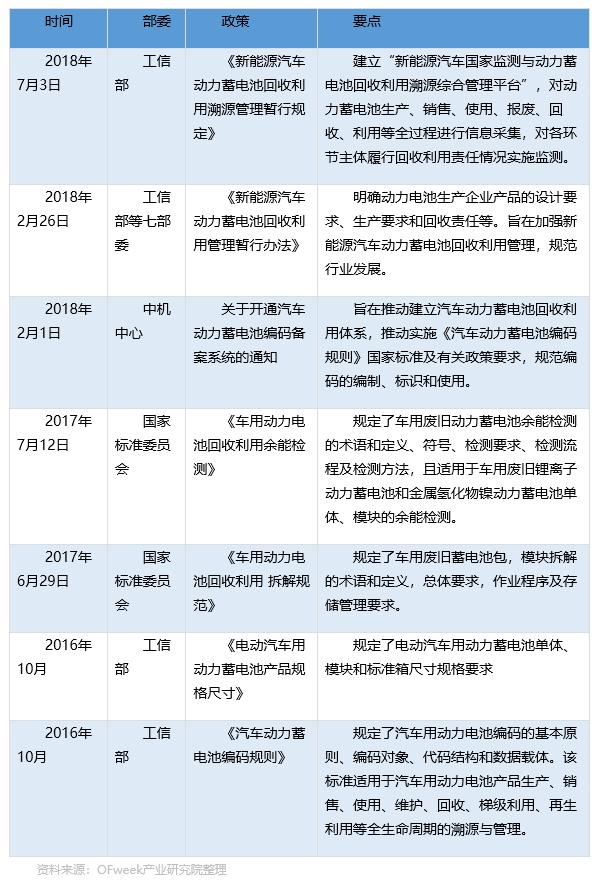 在這之前,已經(jīng)有《新能源汽車動(dòng)力蓄電池回收利用管理暫行辦法》、《汽車動(dòng)力蓄電池編碼規(guī)則》、《電動(dòng)汽車用動(dòng)力蓄電池產(chǎn)品規(guī)格尺寸》、《車用動(dòng)力電池回收利用 拆解規(guī)范》和《車用動(dòng)力電池回收利用余能檢測》等政策法規(guī)出臺(tái),為動(dòng)力電池的回收利用奠定了基礎(chǔ)。
