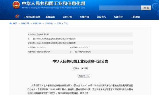 2018年7月3日,工業(yè)和信息化部公告《新能源汽車動(dòng)力蓄電池回收利用溯源管理暫行規(guī)定》,自2018年8月1日起施行,旨在推進(jìn)動(dòng)力蓄電池回收利用。辦法要求建立“新能源汽車國家監(jiān)測與動(dòng)力蓄電池回收利用溯源綜合管理平臺(tái)”,對(duì)動(dòng)力蓄電池生產(chǎn)、銷售、使用、報(bào)廢、回收、利用等全過程進(jìn)行信息采集,對(duì)各環(huán)節(jié)主體履行回收利用責(zé)任情況實(shí)施監(jiān)測。在溯源管理規(guī)定出臺(tái)之前,動(dòng)力電池銷售后是無法跟蹤的,電池的運(yùn)行狀態(tài)和使用狀況都電池廠不得而知,在消費(fèi)者手里的動(dòng)力電池報(bào)廢后也難以追溯到生產(chǎn)廠家進(jìn)行回收。此項(xiàng)目出臺(tái)后,將會(huì)更好的推進(jìn)動(dòng)力電池回收的回收利用。