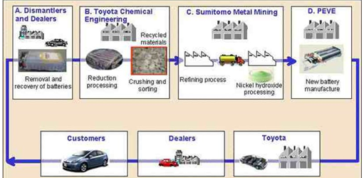 2011年,豐田在日本與住友金屬合作,實(shí)現(xiàn)鎳的多次利用,能夠回收電池組中50%的鎳。豐田化學(xué)工程和住友金屬礦山為此配置了每年可回收相當(dāng)于1萬(wàn)輛混合動(dòng)力車(chē)電池用量的專(zhuān)用生產(chǎn)線。