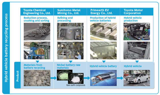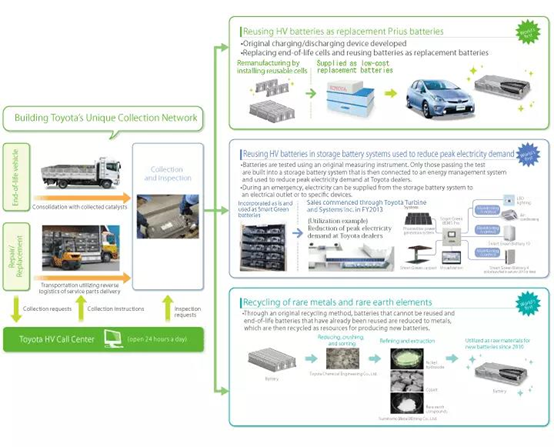 總結(jié)一下,豐田的整個(gè)電池回收利用從以下流程展開(kāi):