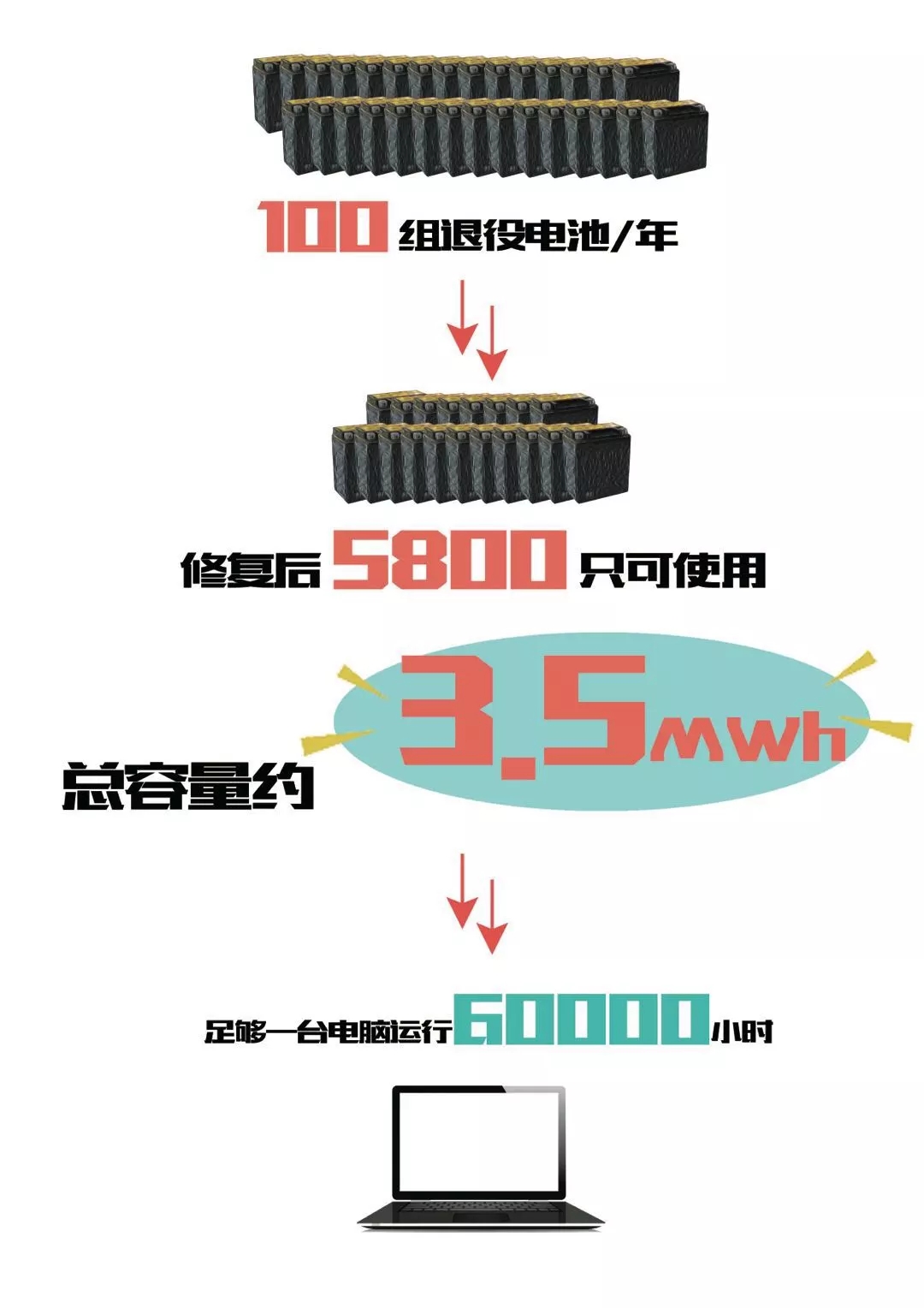 我國(guó)廣州地區(qū),每年約有100組鉛酸鋰電池電池從南方電網(wǎng)廣州供電局退役,經(jīng)修復(fù)可使用的退役電池可達(dá)5800只,總?cè)萘考s3.5MWh,這些電能足夠一臺(tái)筆記本電腦運(yùn)行6萬(wàn)個(gè)小時(shí)。