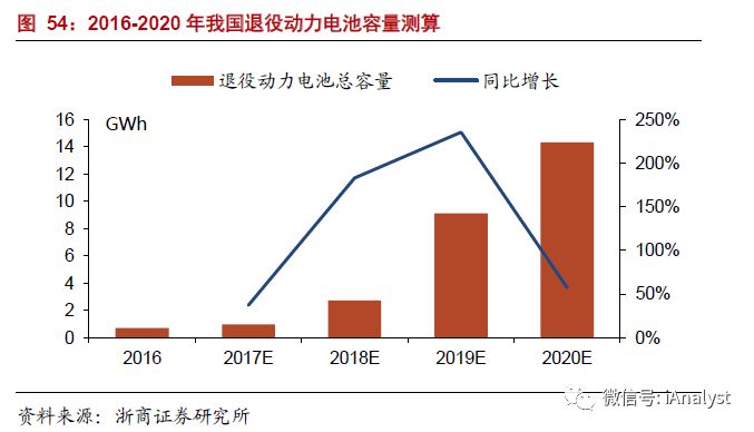 我們測算,截至2017年底,市場上新能源汽車的保有量已經(jīng)超過160萬輛。我們研究判斷,2016、2017年退役的動力電池多為2012-2013年開始服役。我們根據(jù)2011年以來新能源汽車歷年產(chǎn)銷數(shù)據(jù)進(jìn)行統(tǒng)計(jì)、測算,判斷2018~2020年將迎來動力電池退役潮,如圖54所示,預(yù)計(jì)2018-2020年的動力電池退役容量分別為2.7GWh、9.1GWh、14.3GWh,同比增速分別為182.9%、235.4%、57.1%。由此可見,解決退役動力電池回收利用的問題迫在眉睫。