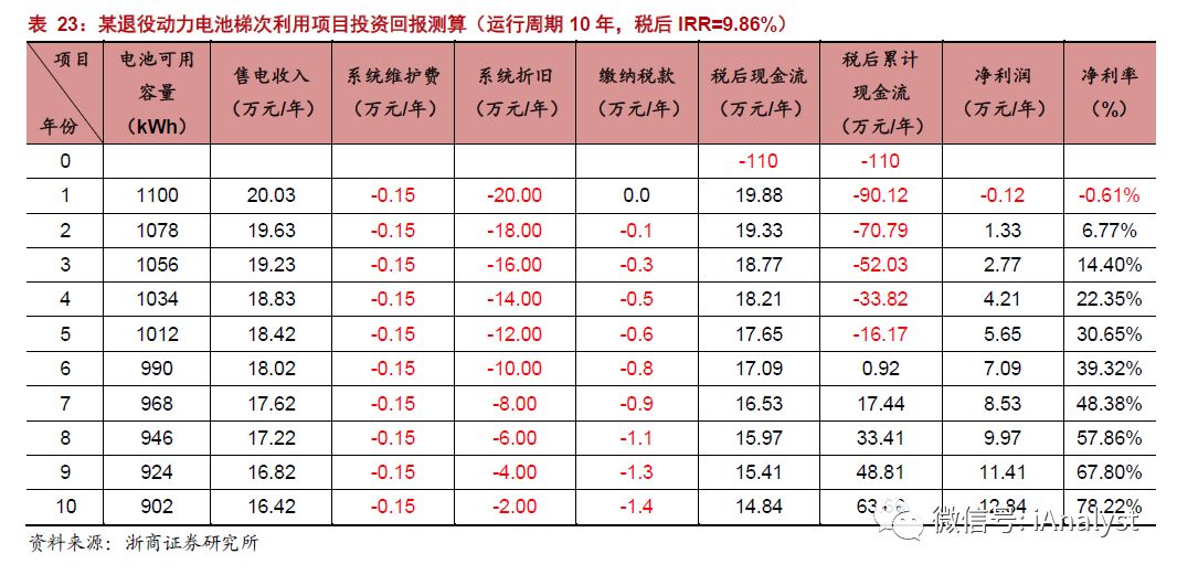 退役動力電池梯次利用項(xiàng)目投資回報(bào)測算具體如表23所示。