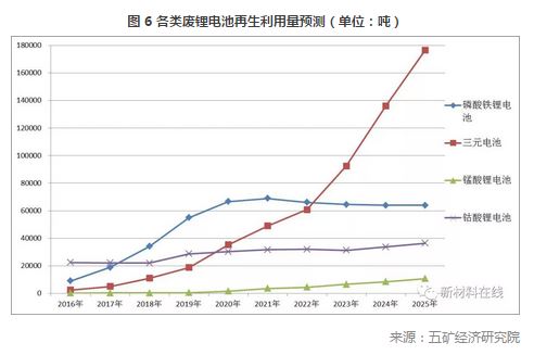 就鋰電池再生利用而言,可供再生利用的廢舊鋰電池來源不僅來自直接報廢的退役動力電池,還有廢舊的消費(fèi)鋰電池、電池企業(yè)等的生產(chǎn)廢料、報廢的梯級利用電池等重要來源。經(jīng)過測算,未來 5 年內(nèi)主要的再生利用電池仍然是缺乏回收價值的磷酸鐵鋰電池。但三元動力電池的再生利用量將從 2020 年開始快速放量,并超過消費(fèi)鋰電池的再生利用量;從 2023 年開始,三元動力電池將進(jìn)一步超過磷酸鐵鋰電池成為再生利用的主要對象。