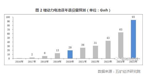 2014 年來,隨著我國新能源汽車行業(yè)的快速發(fā)展,動力電池的回收問題也逐漸提上日程。一般動力電池會在 5-6 年后退役,商用車動力電池甚至 2-3 年就會退役。因此,從2018-2019 年開始,我國將會有大量的動力電池進(jìn)入報廢期。根據(jù)我們的綜合測算,2020 年我國將有約 20Gwh 的動力電池退役,2025 年將有大約 93Gwh 的動力電池退役。