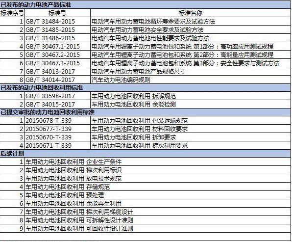 目前,關于動力電池產品國家標準主要有8項,集中規(guī)范了動力電池性能測試要求與方法、動力電池安全性測試要求與方法。關于動力電池回收利用的標準,已發(fā)布的標準有2項、已提交審批的標準有4項目,還有9項后續(xù)計劃出臺的標準。