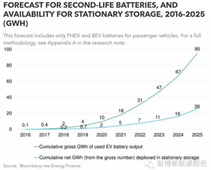 2016到2025年間,二手電動車電池的容量將達到95GWh,大約是當今全球固定式儲能容量的60倍。