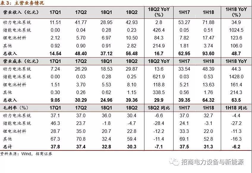 分季度看,2018Q2公司扣非后凈利潤為4.28億元,同比下滑33%。今年Q2公司業(yè)績增速與裝機(jī)量增速出現(xiàn)較大偏差,主要源于1)Q2公司動力電池價(jià)格下滑較多,帶來毛利率下滑同比下滑6.6個(gè)百分點(diǎn)至30.4%;2)Q2鋰電材料營業(yè)成本同比大幅上升,拖累毛利率同比下滑12.2個(gè)百分點(diǎn)至22.8%。