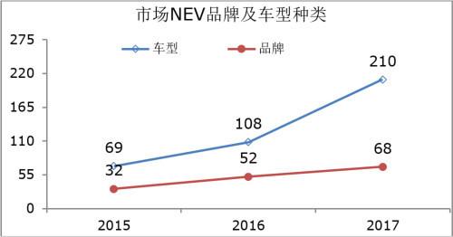2017年,中國新能源乘用車銷量為57.9萬,其中純電動汽車有46.8萬輛,插電式混合動力車為11.1萬輛。 2015-2017年,中國新能源乘用車品牌種類逐年增加,由32個增至68個,對應車型數(shù)量由69款增至210款。總體呈多樣化趨勢發(fā)展,整體走勢良好。