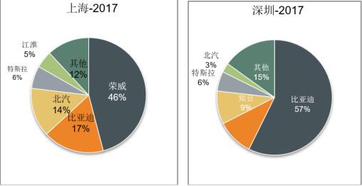 深圳地區(qū)對新能源汽車推廣力度較大,深圳提出到2020年全部出租車和公交車都為純電動汽車,且新注冊的網約車必須為新能源汽車;但其比亞迪特色非常明顯,出租車均為比亞迪e5車型,私家車中比亞迪占比也較高。