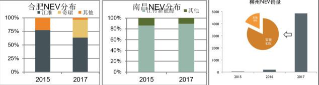 而柳州得益于“柳州模式”,成為通過“政企聯(lián)動”機制推新能源車推廣的成功案例。2017年其新能源汽車銷量由僅數(shù)百輛攀升至近1萬輛,其中82%的比例為本地品牌寶駿E100。這種“政企聯(lián)動”方式僅適用于新能源市場起步晚的地區(qū),對于發(fā)展中或趨于成熟的市場應減弱政策作用。