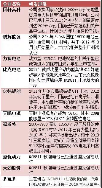 在國內(nèi),NCM811頻繁出鏡,國內(nèi)諸多鋰電企業(yè)都表示出了對NCM811電池產(chǎn)能布局的熱情。從下表可以看出,有諸多動力電池企業(yè)宣稱已經(jīng)商用811,還有一批企業(yè)已經(jīng)做好了量產(chǎn)供應的準備,也有一批還處在研發(fā)、測試階段。