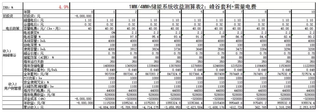 測(cè)算表2的結(jié)果顯示,系統(tǒng)綜合靜態(tài)回收期在8年以內(nèi),內(nèi)部收益率4.9%,雖偏低,但可通過(guò)調(diào)節(jié)儲(chǔ)能小時(shí)數(shù)來(lái)顯著提升收益狀況,比如1MW/3MWh系統(tǒng)的IRR=8.4%,回收期7年以內(nèi),1MW/2MWh系統(tǒng)的IRR=14.7%,回收期5年以內(nèi),相當(dāng)可觀。