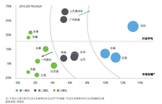 中國儲能網(wǎng)訊:如果把中國汽車品牌(乘用車)分成幾個梯隊,那么從規(guī)模量級看,已經(jīng)跨過100萬輛門檻的吉利汽車、長城汽車和長安汽車屬于“第一軍團”;年銷介于50萬輛到100萬輛之間的上汽集團、廣汽集團、奇瑞汽車、北汽集團和東風汽車處在“第二陣營”;低于50萬輛的眾泰汽車、東南汽車、一汽轎車、江淮汽車、華晨、比亞迪等“第三梯隊”,則面臨前所未有的巨大壓力。