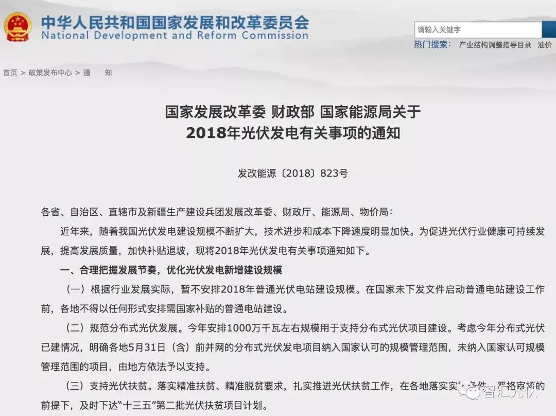 2018年5月31日,三部委聯(lián)合下發(fā)《關(guān)于2018年光伏發(fā)電有關(guān)事項(xiàng)的通知(發(fā)改能源〔2018〕823號(hào))》文件,將6月1日及以后并網(wǎng)的三類電價(jià)區(qū)的標(biāo)桿電價(jià)直接降至0.5元/kWh、0.6元/kWh、0.7元/kWh。