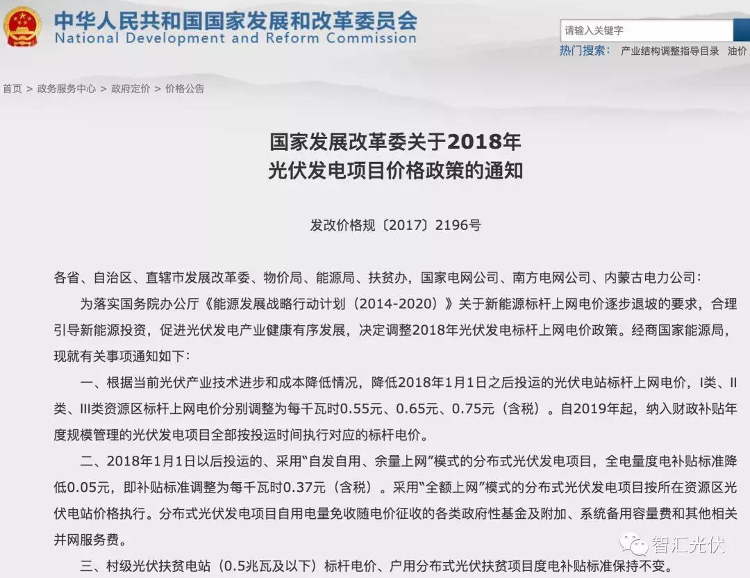 2017年12月19日,國(guó)家發(fā)展改革委《關(guān)于2018年光伏發(fā)電項(xiàng)目?jī)r(jià)格政策的通知(發(fā)改價(jià)格規(guī)〔2017〕2196號(hào))》,提出: