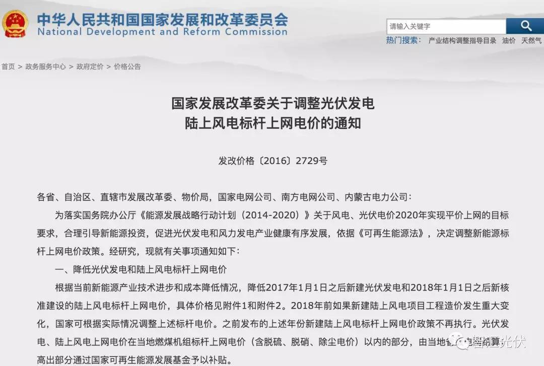 2016年12月26日,國(guó)家發(fā)展改革委下發(fā)《關(guān)于調(diào)整光伏發(fā)電陸上風(fēng)電標(biāo)桿上網(wǎng)電價(jià)的通知(發(fā)改價(jià)格〔2016〕2729號(hào))》,提出: