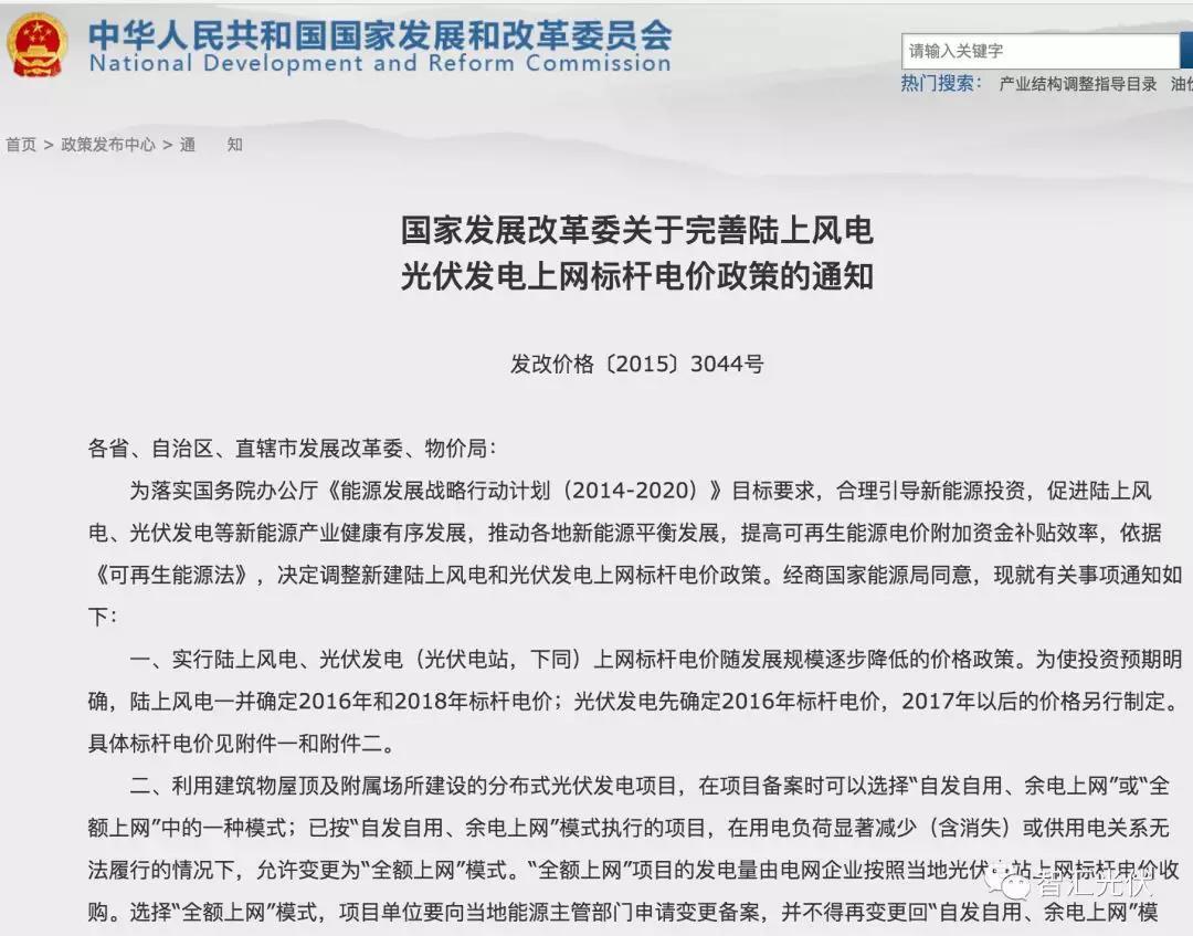 2015年12月22日,國(guó)家發(fā)展改革委下發(fā)《關(guān)于完善陸上風(fēng)電光伏發(fā)電上網(wǎng)標(biāo)桿電價(jià)政策的通知(發(fā)改價(jià)格〔2015〕3044號(hào))》,提出:
