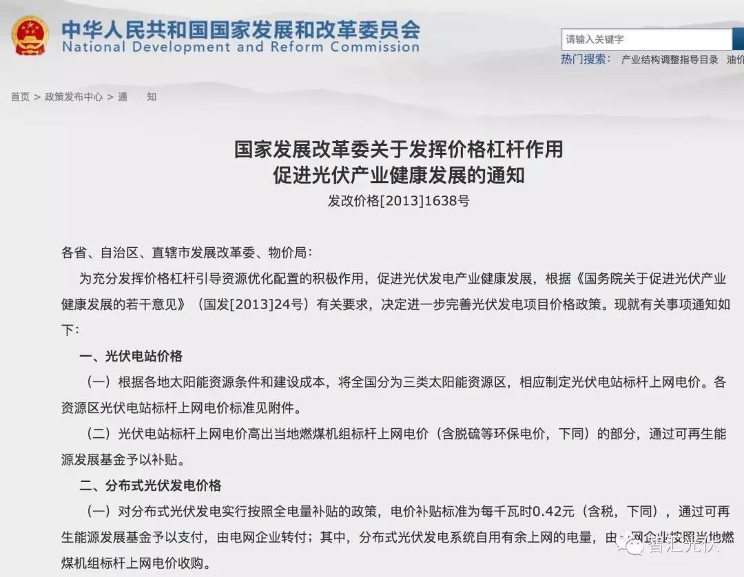 2013年8月26日,國(guó)家發(fā)展改革委下發(fā)《關(guān)于發(fā)揮價(jià)格杠桿作用促進(jìn)光伏產(chǎn)業(yè)健康發(fā)展的通知(發(fā)改價(jià)格[2013]1638號(hào))》提出: