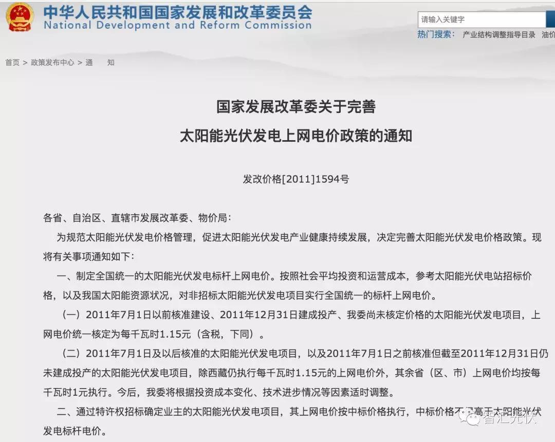 2011年,出臺(tái)了我國(guó)第一個(gè)地面光伏電站的標(biāo)桿電價(jià)政策, 7月1日前備案、12月31日之前并網(wǎng)項(xiàng)目,上網(wǎng)為 1.15元/kWh;之后的項(xiàng)目為1元/kWh;分布式光伏繼續(xù)執(zhí)行初始投資補(bǔ)貼。