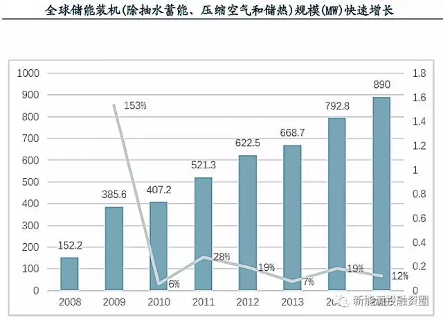 從全球角度看,自2008年以來,儲能進入了快速成長階段,裝機規(guī)模以每年20%左右的速度快速增長。我國自2013年以來,隨著分布式光伏裝機容量快速增長,以及2015年下半年以來電力體制改革加速進行,部分地區(qū)電價機制更加靈活,用戶側(cè)使用儲能能夠獲得即時且明顯的經(jīng)濟效益,用戶側(cè)儲能裝機容量快速增長。