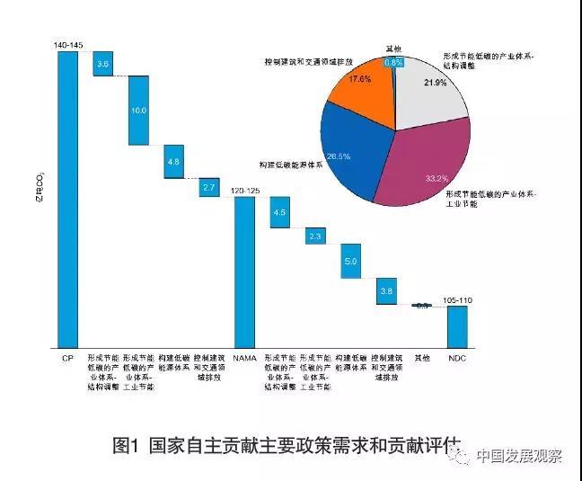 為實現(xiàn)應對氣候變化自主貢獻目標,中國在上述方案中進一步提出了將在國家戰(zhàn)略、區(qū)域戰(zhàn)略、能源體系、產(chǎn)業(yè)體系、建筑交通、森林碳匯、生活方式、適應能力、發(fā)展模式、科技支撐、資金支持、市場機制、統(tǒng)計核算、社會參與、國際合作等共15個領域采取強化行動的政策和措施。這些政策和措施對實現(xiàn)國家自主貢獻目標有直接或間接的推動作用。根據(jù)國家氣候戰(zhàn)略中心的評估,除戰(zhàn)略部署和保障措施之外,現(xiàn)有直接政策的預期實施效果和貢獻如圖1所示。上述政策措施目前穩(wěn)步推進并已取得了明顯成效。一是2020年前政策實施和目標完成好于預期規(guī)劃。截至2016年, 中國單位國民生產(chǎn)總值的二氧化碳排放強度相對2005年已下降42.8% 左右,有望超額完成2020年40%- 45%的國家適當減緩行動目標;非化石能源占一次能源消費的比重已達到13.3%,可再生能源發(fā)電裝機容量達到5.58億千瓦,發(fā)電量達到1.49萬億千瓦時,占總發(fā)電量的24.8%;森林蓄積量相對2005年已增加超過26.8億立方米,提前超額完成了2020年目標;二氧化碳排放增速趨緩,2015年和2016年甚至出現(xiàn)小幅下降。二是制度和支撐體系逐步建立完善。國家應對氣候變化領導小組統(tǒng)一領導、國家發(fā)展改革委歸口管理、有關部門和地方分工負責、全社會廣泛參與的應對氣候變化管理體制和工作機制初步形成,同時開展了應對氣候變化法的前期研究及立法起草工作,發(fā)布了《國家應對氣候變化規(guī)劃(2014- 2020年)》《國家適應氣候變化戰(zhàn)略》《單位國內(nèi)生產(chǎn)總值二氧化碳排放降低目標責任考核評估辦法》《全國碳排放權交易市場建設方案(發(fā)電行業(yè))》等重要規(guī)劃和政策性文件,國家、地方、企業(yè)三級溫室氣體排放統(tǒng)計核算體系初步建立,全國碳排放權交易體系啟動實施,低碳省市、城鎮(zhèn)、園區(qū)、社區(qū)等試點示范持續(xù)推進,省級人民政府碳排放強度目標責任評價考核工作正式開展,全國31個省區(qū)市(不含港澳臺)全部編制完成省級應對氣候變化規(guī)劃或低碳發(fā)展規(guī)劃,工業(yè)、能源、建筑、交通、林業(yè)、公共機構(gòu)等領域相繼發(fā)布了各自的專項規(guī)劃、工作方案或?qū)嵤┮庖?。三是正向激勵和協(xié)同效益初步顯現(xiàn)。政策的實施催生了更多新技術、新產(chǎn)業(yè)、新模式的發(fā)展,加快培育了新增長點、新動能,綠色低碳發(fā)展的經(jīng)濟體系正在逐步形成。按照國家氣候戰(zhàn)略中心的測算,2005年至2015年國內(nèi)累計完成的低碳投資約為10.4萬億,低碳產(chǎn)業(yè)年產(chǎn)值約為8.4萬億。這些政策的實施有效增加了低碳供給、投資和就業(yè),產(chǎn)生了很好的經(jīng)濟、社會和環(huán)境協(xié)同效應,為下一階段的實施形成了較好的氛圍和勢頭。