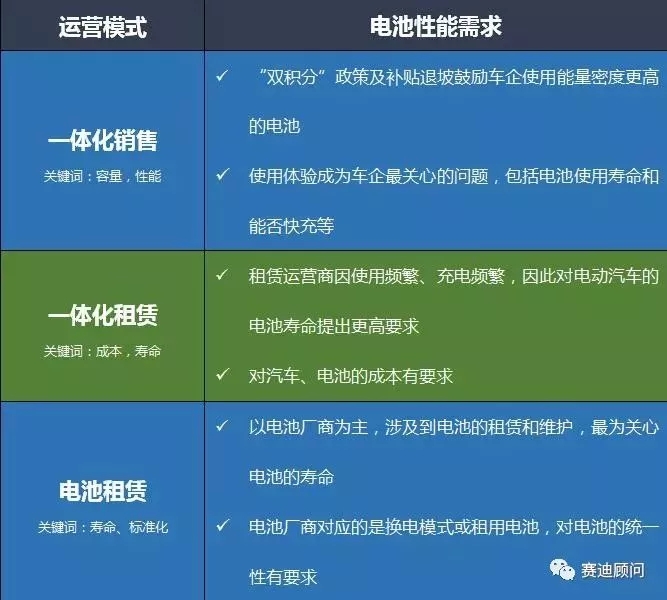 在多樣化的運營模式和使用場景對電池性能也提出了不同要求。一體化銷售的運營模式以車企主導為特點,更關注電池的容量和性能;一體化租賃則以第三方運營商主導,對電池成本和壽命提出了更高要求;電池租賃以電池廠商為主導,要求電池的壽命更長、一致性和標準化程度更高。