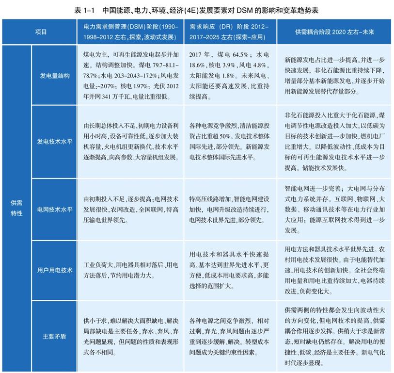 表1-1 是能源、電力、環(huán)境、經(jīng)濟(jì)(4E)發(fā)展要素與DSM的影響和變革趨勢表。從表中不難看出,DSM、DR以及供需耦合,都是以解決電力供需問題為導(dǎo)向的,因此,任何管理手段都必須隨著問題的發(fā)展和解決問題的需求與時俱進(jìn)。DSM每個階段的時間長短并不相同,變革并不因?yàn)闀r間長短而變,而供需特性和低碳(結(jié)構(gòu))特性變化才是關(guān)鍵點(diǎn),即電力短缺與富余度以及新能源所占的發(fā)電比重大小決定了不同階段到來的時間點(diǎn)。從電力需求管理手段的內(nèi)涵上看,三個階段在時間的連接處和對應(yīng)的措施上是會有重疊的,且后一階段的措施是對前一階段的繼承、完善、發(fā)展而不是割裂。面向未來,一般意義上的電力需求管理將會一直延續(xù)至電力的長遠(yuǎn)發(fā)展,但作為傳統(tǒng)或特定意義上的“DSM”的作用將隨著電力供需矛盾轉(zhuǎn)化、能源電力清潔低碳轉(zhuǎn)型發(fā)展、電力技術(shù)和用電技術(shù)的進(jìn)步等而逐步淡化,并終將成為歷史。