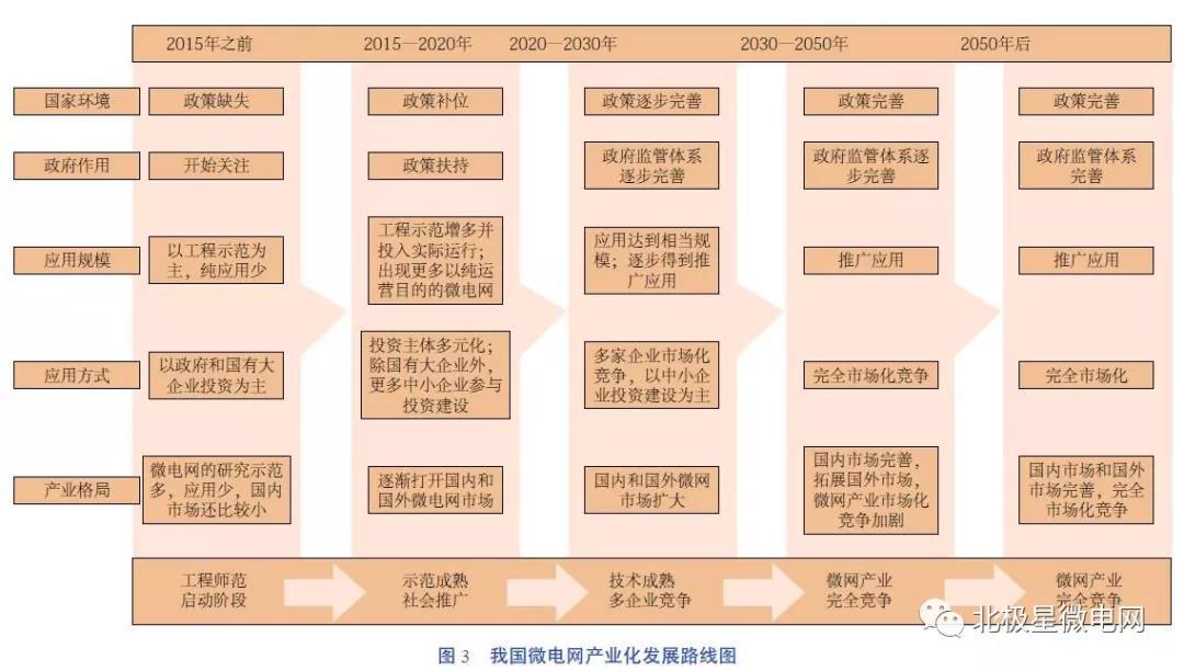 從樂觀角度看,未來 20 年將是微網(wǎng)產(chǎn)業(yè)政策完善階段,也是市場化蓬勃發(fā)展的階段。微網(wǎng)發(fā)展大幅向企業(yè)及獨立經(jīng)營型轉(zhuǎn)變的階段,且不需要政府補(bǔ)貼,市場相對開放,競價策略將會大幅推廣。對微網(wǎng)產(chǎn)業(yè)化發(fā)展路線詳細(xì)預(yù)測如圖 3 和圖 4 所示。