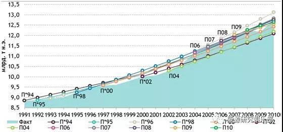 上圖中,具體年份相對誤差的平均值為2.05億噸石油當(dāng)量,或2%左右,最大值為6.76億噸石油當(dāng)量,或不超過5%。如果不經(jīng)修正,上世紀(jì)90年代IEA的預(yù)測數(shù)據(jù)誤差會較大,這并不是IEA統(tǒng)計(jì)模型準(zhǔn)確性的問題,而是一次能源消費(fèi)統(tǒng)計(jì)核算的特點(diǎn)所致。