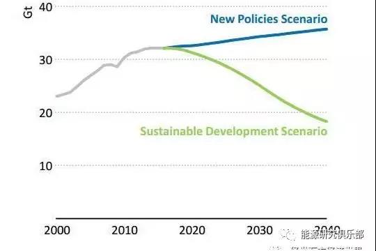 圖4 新政策情景及可持續(xù)發(fā)展情景下全球二氧化碳排放量趨勢