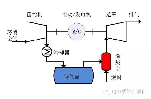 壓縮空氣儲能系統(tǒng)可利用低谷電、棄風(fēng)電、棄光電等對空氣進(jìn)行壓縮,并將高壓空氣密封在地下鹽穴、地下礦洞、過期油氣井或新建儲氣室中,在電網(wǎng)負(fù)荷高峰期釋放壓縮空氣推動透平機(jī)(氣輪機(jī)、渦輪機(jī)等)發(fā)電。按照運(yùn)行原理,壓縮空氣儲能系統(tǒng)可以分為補(bǔ)燃式和非補(bǔ)燃式兩類。