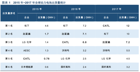 2015年,寧德時代的動力電池出貨量0.78,全球排名第五;2016年,寧德時代的出貨量為6.8GWh,全球排名第三,位于松下與比亞迪之后;到了2017年,寧德時代出貨量大漲73%,達(dá)到12GWh,成為全球第一。寧德時代順利成為全球動力電池出貨量最高的企業(yè),成功坐穩(wěn)國產(chǎn)動力電池企業(yè)的第一把交椅。