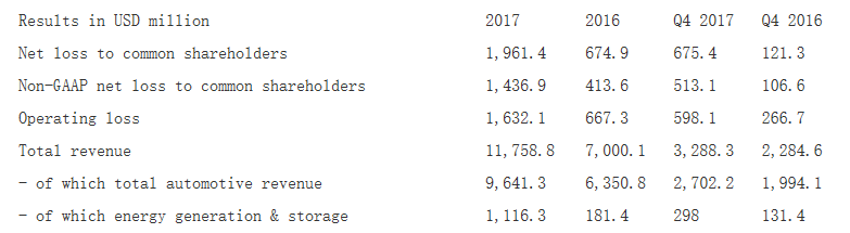 中國(guó)儲(chǔ)能網(wǎng)訊:特斯拉公司(Tesla Inc.)(納斯達(dá)克股票代碼:TSLA)2017年凈虧損額從2016年的6.749億美元擴(kuò)大至19.6億美元(合16億歐元),盡管同期營(yíng)收大幅增長(zhǎng)了68%。這家電動(dòng)汽車和光伏產(chǎn)品制造商周三公布,根據(jù)非美國(guó)通用會(huì)計(jì)準(zhǔn)則對(duì)普通股股東的凈損失近14.4億美元。該公司表示:“到2018年的某個(gè)時(shí)候,我們預(yù)計(jì)將持續(xù)創(chuàng)造季度正盈利?!?