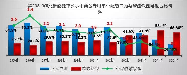 在新能源商務(wù)專(zhuān)用車(chē)領(lǐng)域,業(yè)界公認(rèn)三元的地位,但302批公示顯示,磷酸鐵鋰逐漸侵蝕三元在商務(wù)專(zhuān)用車(chē)領(lǐng)域的地位(見(jiàn)圖2)。