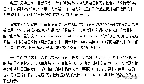 電氣工程專家認(rèn)為:未來配電網(wǎng)將在各個變電站之間使用高速寬芾通信系統(tǒng),利用智能電子設(shè)備(Intelligent electronic devices ,IEDs)進(jìn)行自適應(yīng)控制和保護(hù)。應(yīng)用能量管理系統(tǒng)監(jiān)測配電網(wǎng)的運(yùn)行狀況,并充分采用智能系統(tǒng)減少電能質(zhì)量問題和提高供電可靠性。
