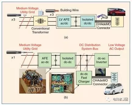 此外,EPRI還研發(fā)出了中壓智能通用變壓器(Intelligent Universal Transformer,IUT)。該技術(shù)替代了獨(dú)立的電能轉(zhuǎn)換器和傳統(tǒng)的變壓器,完全摒棄了傳統(tǒng)變壓器的笨重結(jié)構(gòu)和大量的接線。多功能的IUT可提供400V的直流母線電壓,用于供應(yīng)直流配電系統(tǒng)或?yàn)殡妱榆嚳焖俪潆?,如下圖所示。