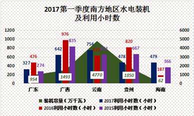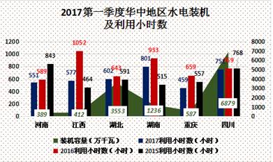 2017年第一季度,全國水電設(shè)備平均利用小時(shí)數(shù)623小時(shí),同比降低68小時(shí)。水電裝機(jī)容量超過1000萬千瓦的7個(gè)省份中,除云南外,其余省份水電設(shè)備平均利用小時(shí)數(shù)同比均有不同程度降低。