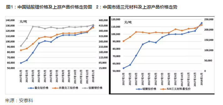 2017年受到海外市場(chǎng)金屬鈷價(jià)大幅上漲的影響,中國(guó)冶煉企業(yè)原料采購(gòu)成本大幅提高,國(guó)內(nèi)鈷鹽價(jià)格也隨之上漲,并導(dǎo)致下游鈷系電池正極材料價(jià)格大幅上漲。