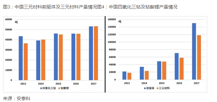 此外2017年鈷酸鋰上游原料四氧化三鈷產(chǎn)量達(dá)到5.3萬(wàn)噸,同比增加15.4%,基本與鈷酸鋰的產(chǎn)量增幅相一致。