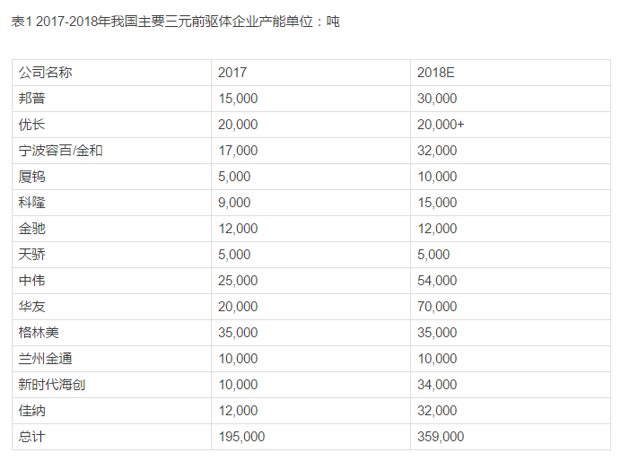 三元材料上游材料三元前驅(qū)體產(chǎn)量同樣出現(xiàn)大幅提高,2017年中國(guó)產(chǎn)三元材料前驅(qū)體產(chǎn)量達(dá)到15萬(wàn)噸,同比增加118%,由于三元材料前驅(qū)體與三元材料型號(hào)相對(duì)應(yīng),所以從產(chǎn)量增幅來(lái)看國(guó)內(nèi)三元材料前驅(qū)體產(chǎn)量略高于三元材料的產(chǎn)量增幅,但二者之間的增幅差距處于正常范圍之內(nèi),除去2017年中國(guó)前驅(qū)體2.46萬(wàn)噸的出口量以及庫(kù)存因素,前驅(qū)體產(chǎn)量基本與三元材料產(chǎn)量相一致。