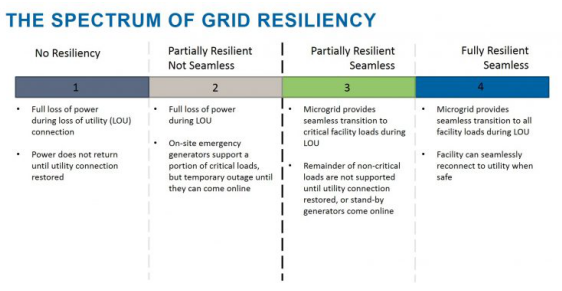圖中所示的微電網(wǎng)彈性范圍從沒有彈性到完全具有彈性,并且可以實(shí)現(xiàn)從連接到電網(wǎng)的實(shí)際無縫過渡。沒有部署微電網(wǎng)的客戶(例如住宅用戶)在電網(wǎng)中斷期間將會(huì)完全中斷。一旦電力公司診斷并解決了電網(wǎng)中斷或故障,其電力才會(huì)恢復(fù)正常。