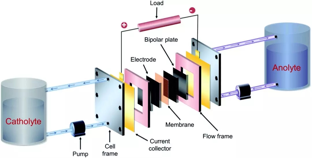 VFBs 系統(tǒng)由一個(gè)電堆、兩個(gè)儲(chǔ)能罐以及配套的液流泵和管路組成。電解液平時(shí)存在儲(chǔ)能罐里,充放電時(shí)泵入電堆中進(jìn)行反應(yīng)。實(shí)際應(yīng)用時(shí),儲(chǔ)能罐、電堆、液流泵等都可以整合于一套集裝箱內(nèi),實(shí)現(xiàn)自動(dòng)化運(yùn)行。