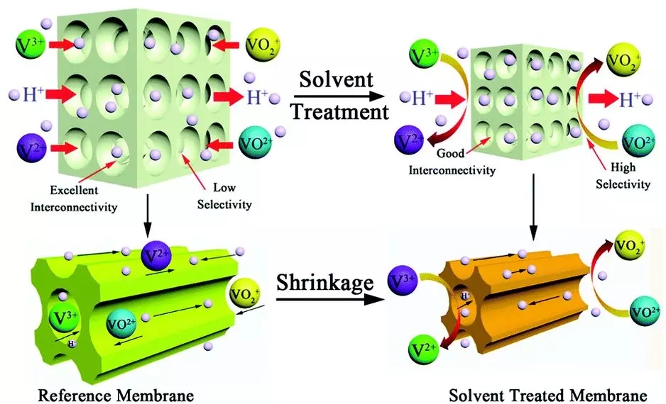 全釩液流電池大規(guī)模應(yīng)用的最大障礙之一便是 VFBs 中通常使用 Nafion 膜:這種膜價(jià)格昂貴,還容易被釩離子堵塞。融科儲(chǔ)能成功開發(fā)了一種基于非氟化聚合物的替代膜,不僅比 Nafion 膜便宜 80%,還具有更小的孔隙,可以實(shí)現(xiàn)更好的離子選擇性。這使得質(zhì)子可以通過膜加速,將電池中的電流密度提高到 160mA/cm2,并顯著提高輸出功率。
