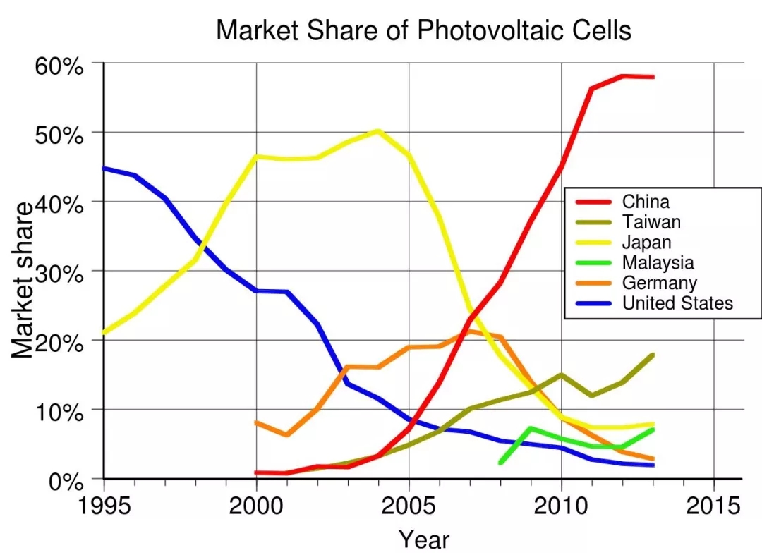 就在十年前,光伏(PV)發(fā)電的每瓦特成本通常會(huì)超過 5 美元;今年,中國制造的硅電池將使每瓦的發(fā)電成本低于 0.25美元。在過去的十年中,中國的光伏產(chǎn)值以驚人的速度增長;中國公司能迅速改進(jìn)生產(chǎn)流程,并及時(shí)采用最新的太陽能技術(shù)。中國目前制造了世界上大部分的太陽能光伏組件;截至 2017 年,光伏裝機(jī)容量已經(jīng)已超過 300GW,占全球總發(fā)電量的 2%。